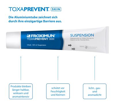 TOXPREVENT® SKIN Suspension – ein Produkt auf Naturbasis, welches schnelle Linderung verspricht, kühlt und kein Brennen verursacht. Die besten Eigenschaften zusammengefasst finden Sie in dieser cremigen Suspension. Die Regeneration der Hautstruktur erfährt eine neue Dimension, da es eine Tiefenwirkung erreicht, welche durch Ästhetikkliniken dermatologisch getestet und bestätigt wurde. Bisher diente es als Klinikbaustein zur Unterstützung der Wundheilung bei geschlossenen, juckenden oder schlecht heilenden Wunden.